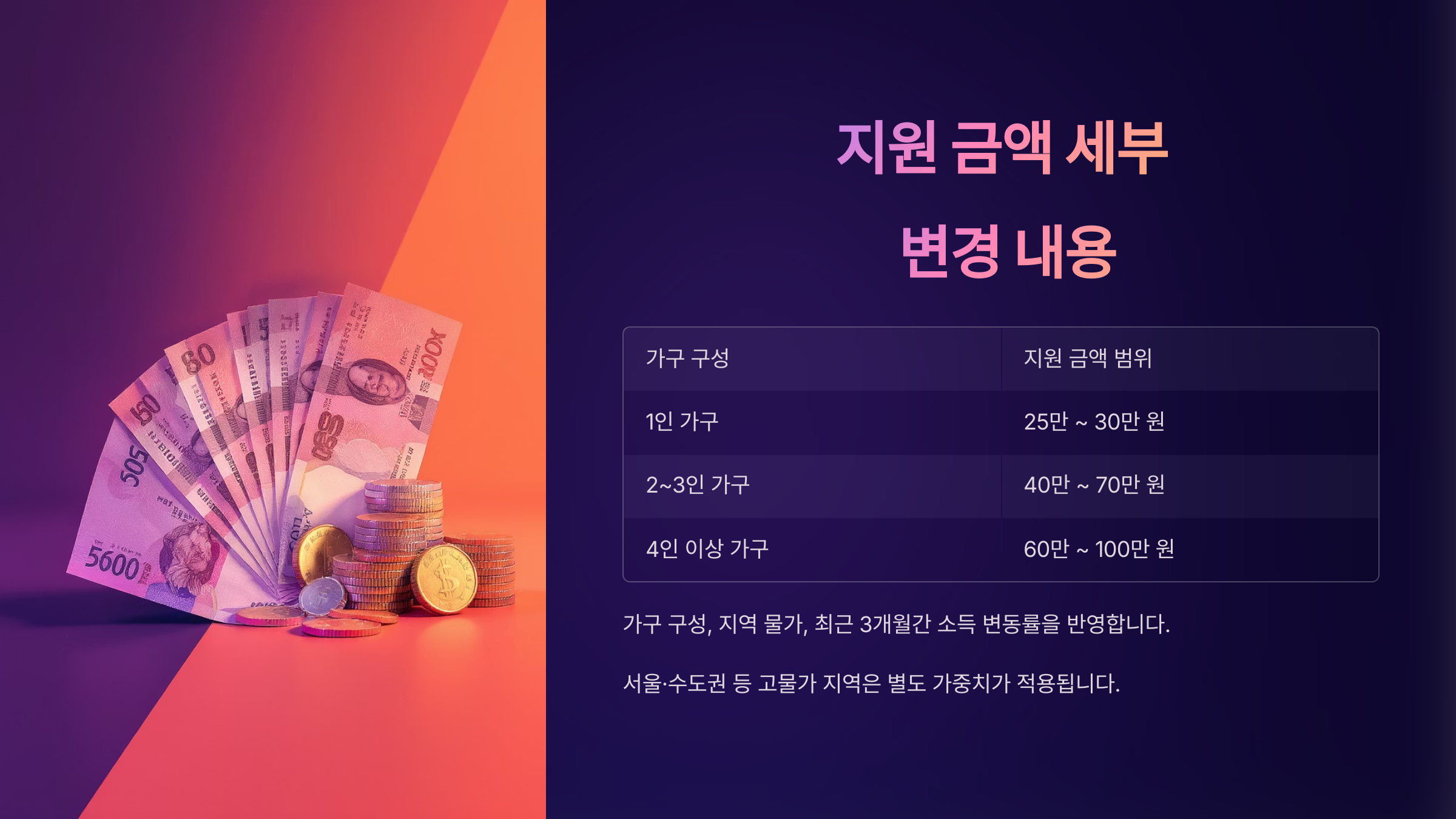 2025년에는 가구 구성과 지역 물가, 최근 3개월간 소득 변동률을 반영해 최소 25만 원에서 최대 100만 원까지 지원됩니다. 특히 서울·수도권 등 고물가 지역은 별도 가중치가 적용돼 상대적으로 더 많은 금액을 받을 수 있어요.