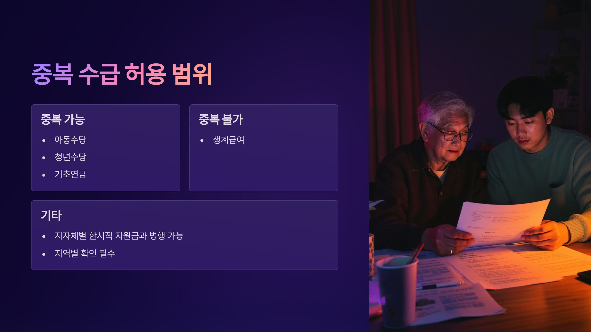 기존에는 여러 복지 혜택과 동시에 수령하는 것이 제한되었지만, 2025년부터는 아동수당, 청년수당, 기초연금 등과 중복 수급이 가능해졌어요. 단, 생계급여와는 여전히 중복이 불가능하므로 유의해야 해요.