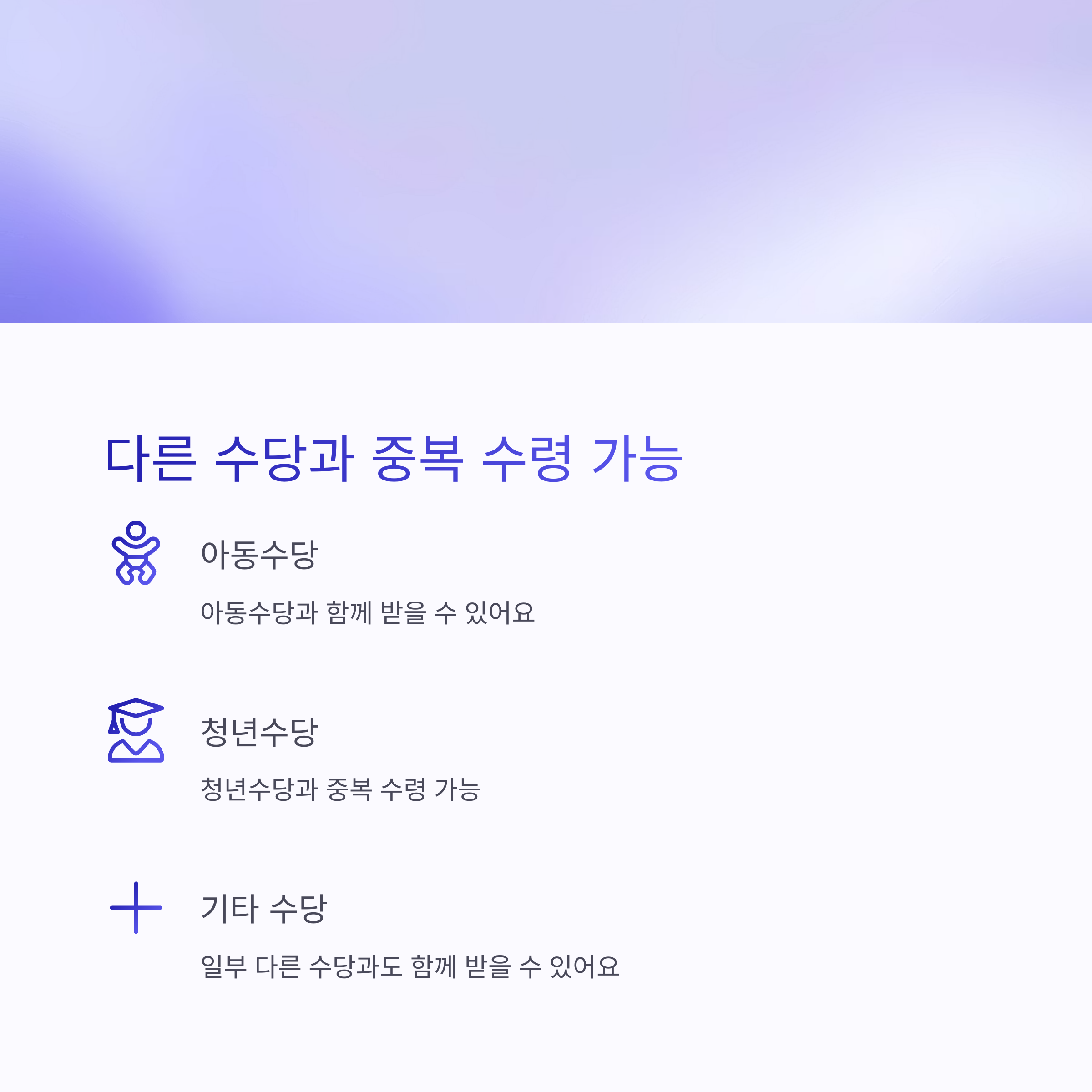 아동수당, 청년수당 등 일부 복지제도와 병행 수령 가능합니다. 단, 생계급여와는 중복 불가입니다.