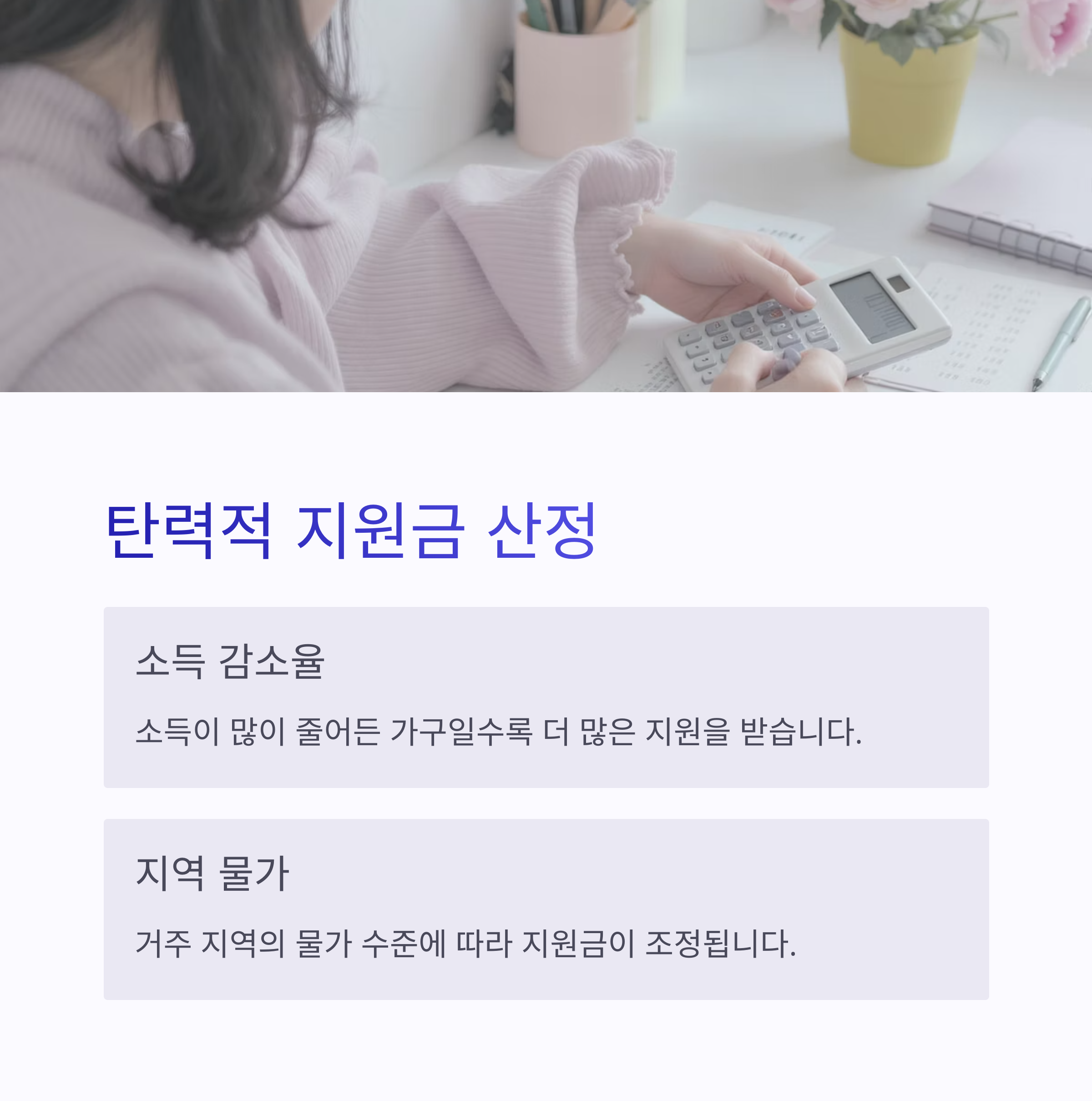 정부는 가구원 수, 지역물가, 위기사유에 따라 지급금액을 탄력적으로 조정하겠다고 밝혔습니다. 예를 들어, 동일한 2인 가구라도 실직 여부나 지역별 소득 수준에 따라 지원액이 달라질 수 있어요.